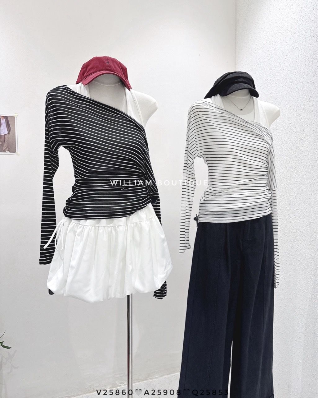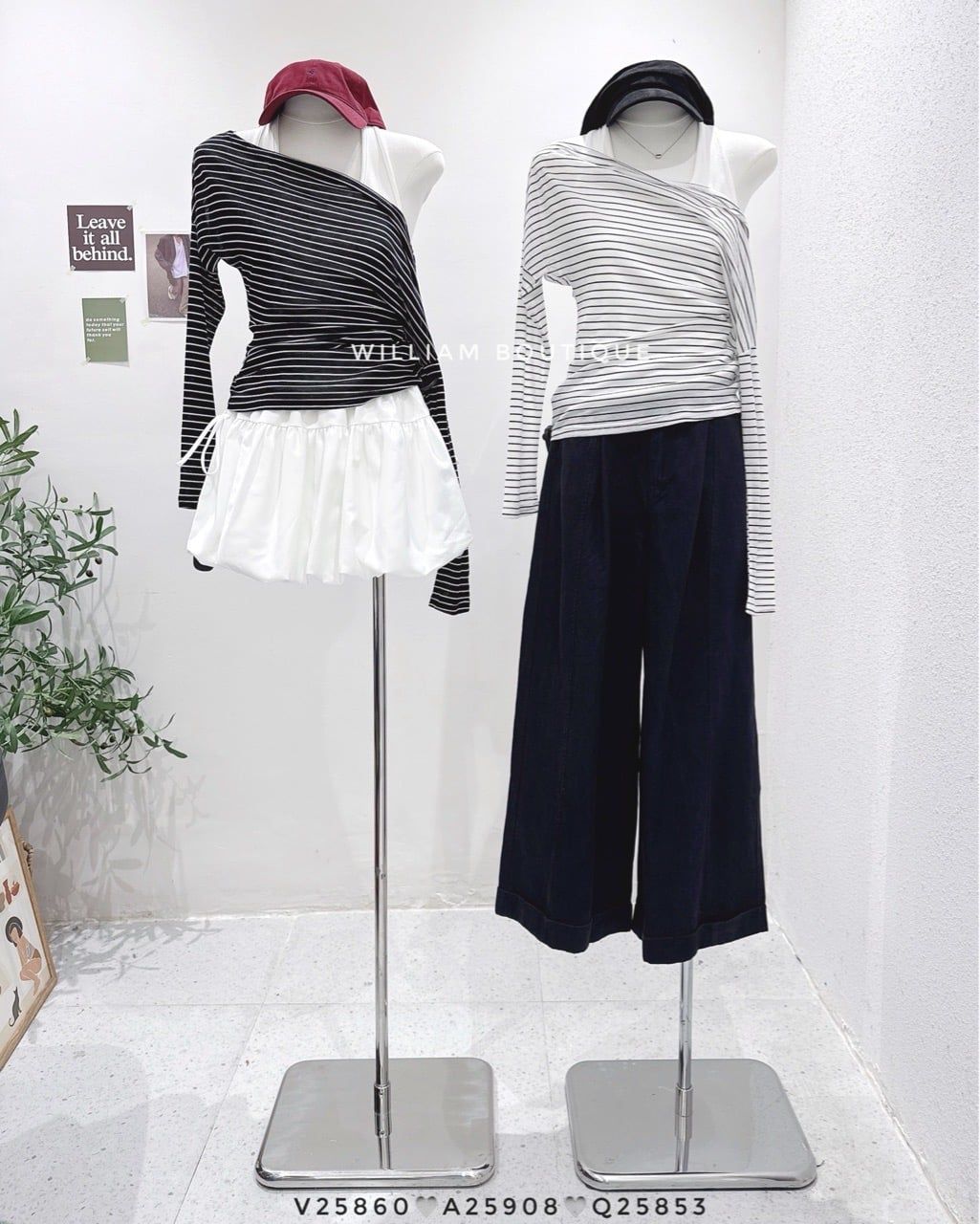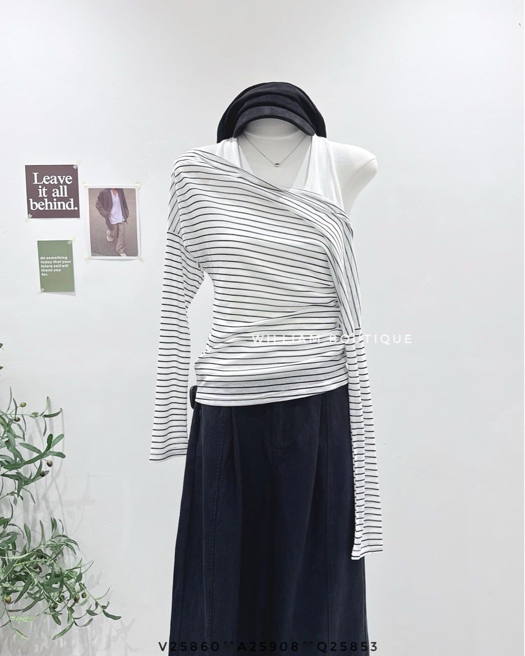 Áo tay dài trễ vai sọc + ba lỗ 6748